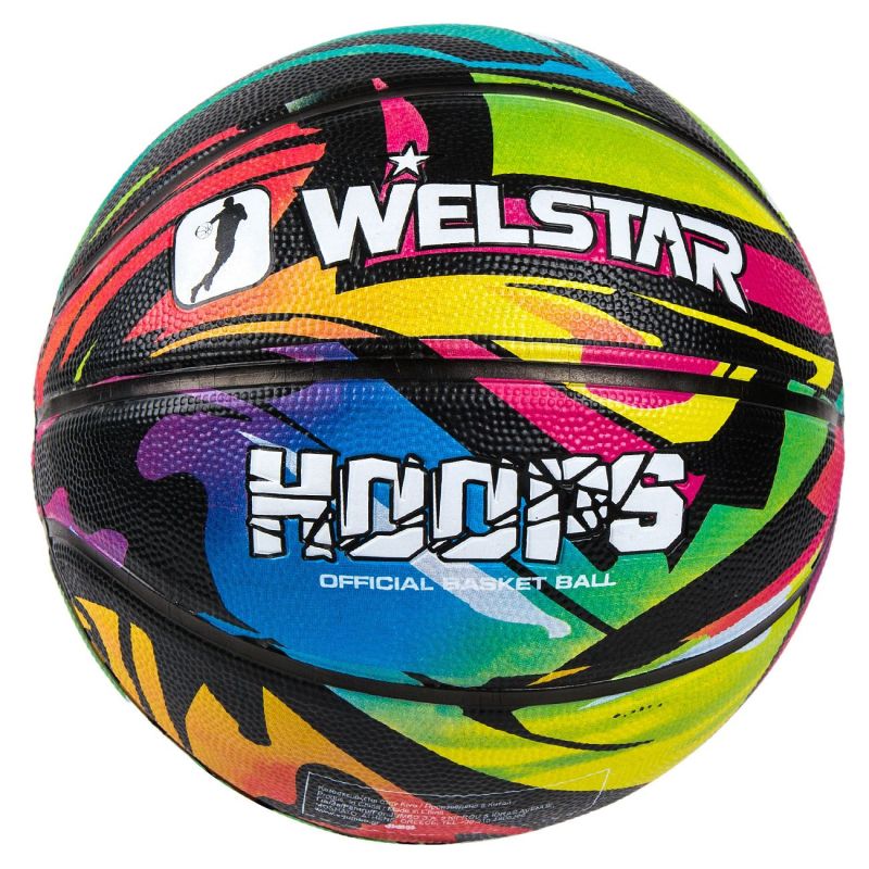 Баскетболна топка със стандартни размери за мач, изработена от устойчиви материали, гарантиращи здравина в многоцветен принт с надписи.