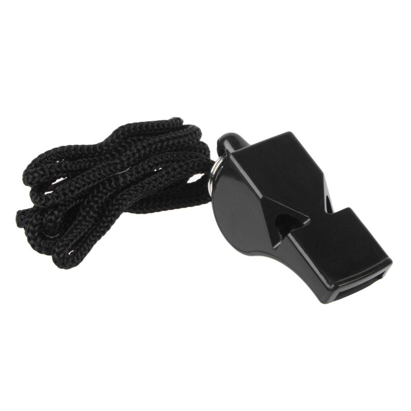 Пластмасова треньорска свирка в черен цвят с връзка за окачване на врата.