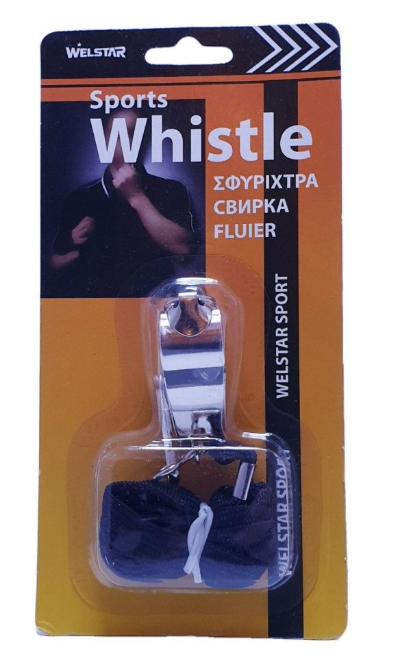 Метална спортна свирка в сребрист цвят със закачалка тип карабина и връзка за окачване на врата.