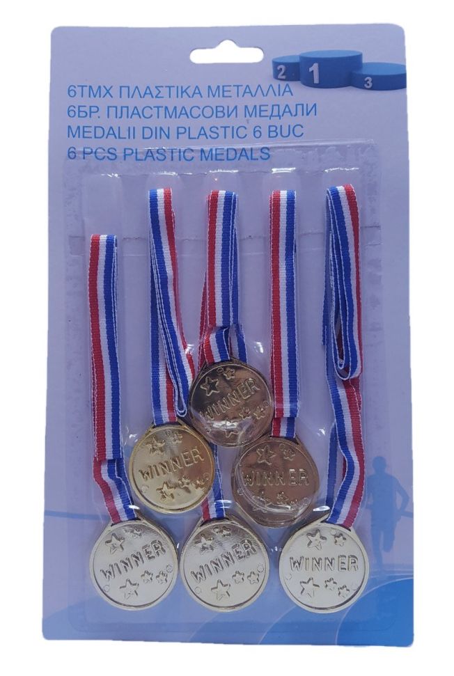 Комплект от 6 броя златни медали, изработени от качествена и здрава пластмаса с трицветна връзка за врата.