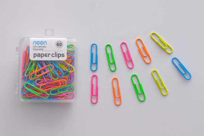 Опаковката съдържа 60 броя кламери в различни цветове с размери 50 мм.