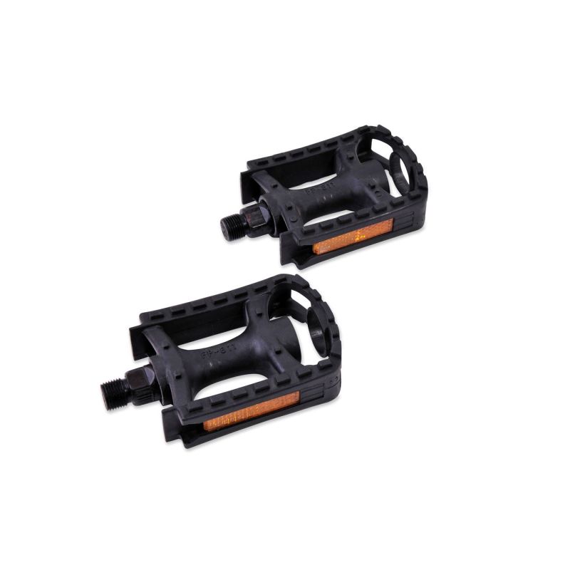 Класически педали за велосипед с ос 9/16", изработени от олекотена и устойчива пластмаса в черен цвят със светлоотразителни елементи.