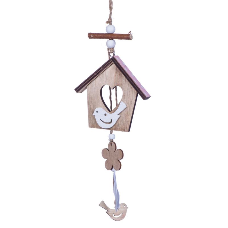 Висяща декорация, изработена от дърво във формата на къщичка с птички.