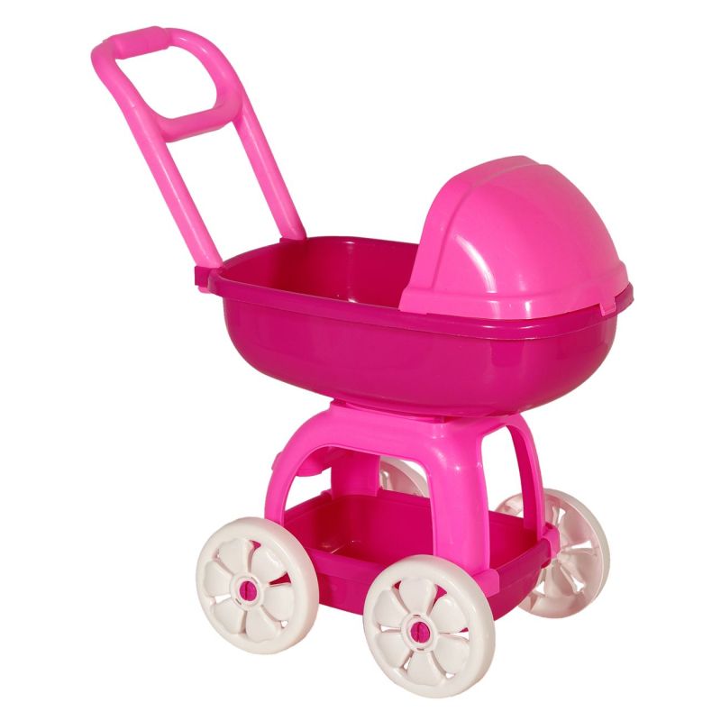 Детска количка за кукла бебе, изработена от устойчива пластмаса в цикламено и розово.
