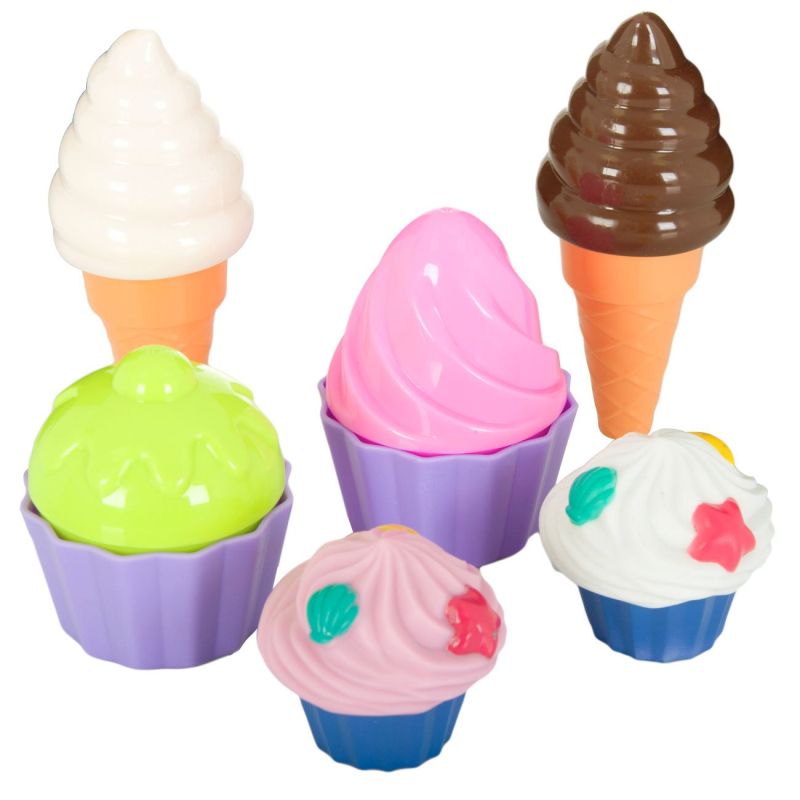 Детски комплект с мъфини и сладолед, изработени от качествена и безвредна пластмаса в ярки цветове.
