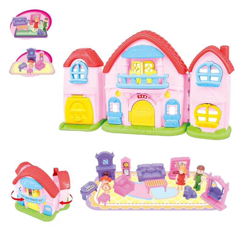 Голяма къща за кукли, изработена от качествена и безвредна пластмаса в ярки цветове с включени фигурки и мебели.