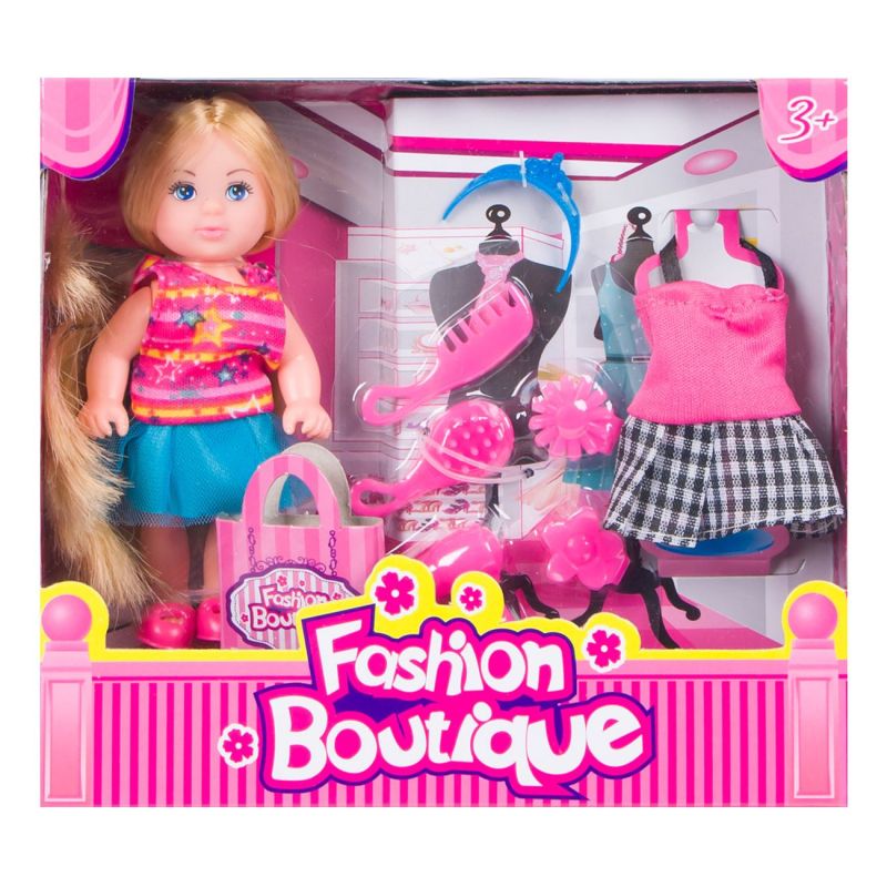 Детски комплект кукла с бутик, дрехи за преобличане и различни аксесоари + гребен, сешоар, четка за коса и други.