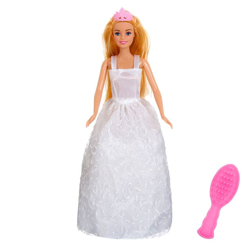 Кукла булка с руси коси, розова корона, красива бяла рокля и четка за коса, за да й правите различни прически.