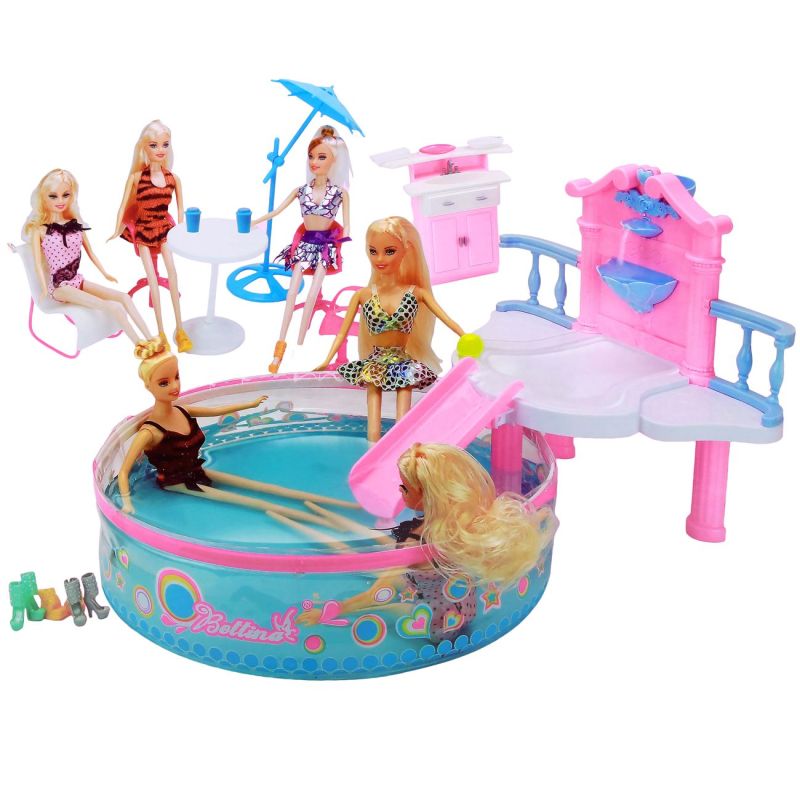 Комплект от 6 кукли с руси коси с красиви бански костюми в ярки цветове и басейн с маса, столове и чадър.