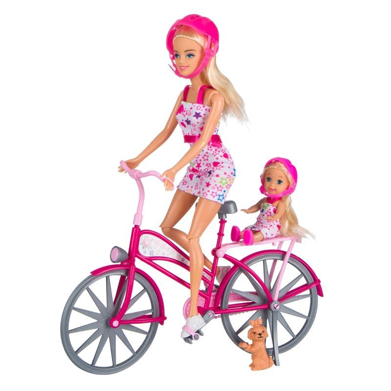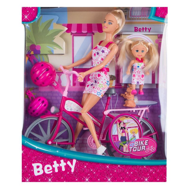 Красива кукла с каска и рокля с принт на звезди и велосипед, изработен от безвредна пластмаса в цикламен цвят. Към нея има и кукла - дете и куче.