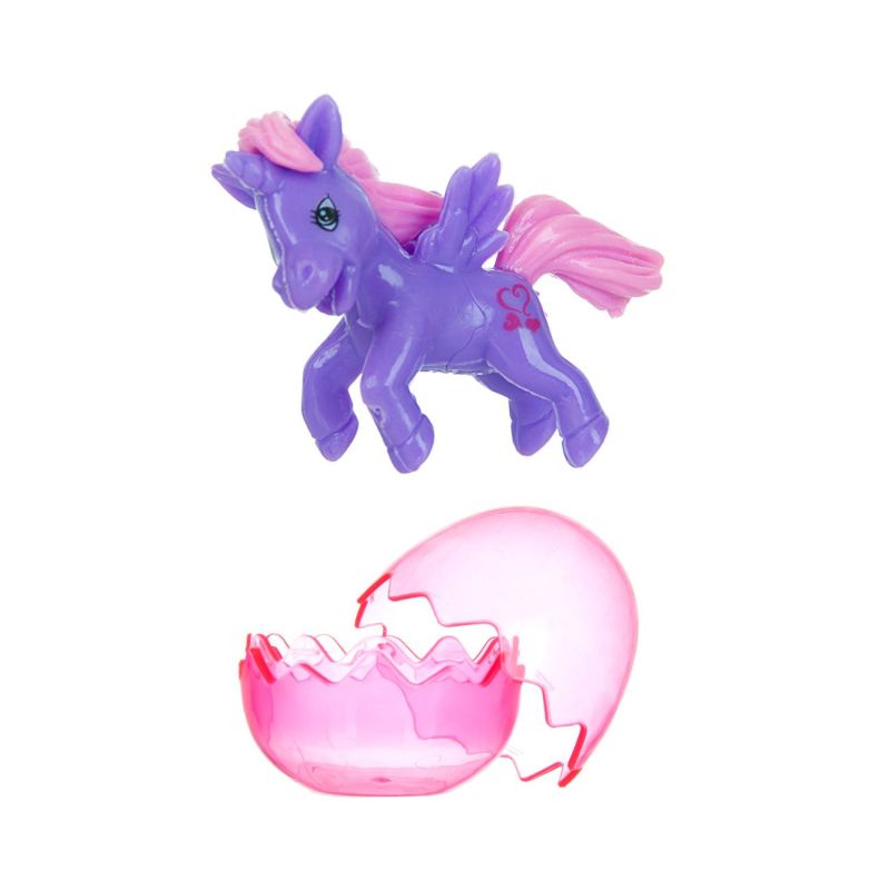 Мини фигурка еднорог в лилав цвят с розова опашка и грива в яйце от прозрачна пластмаса в розов цвят.