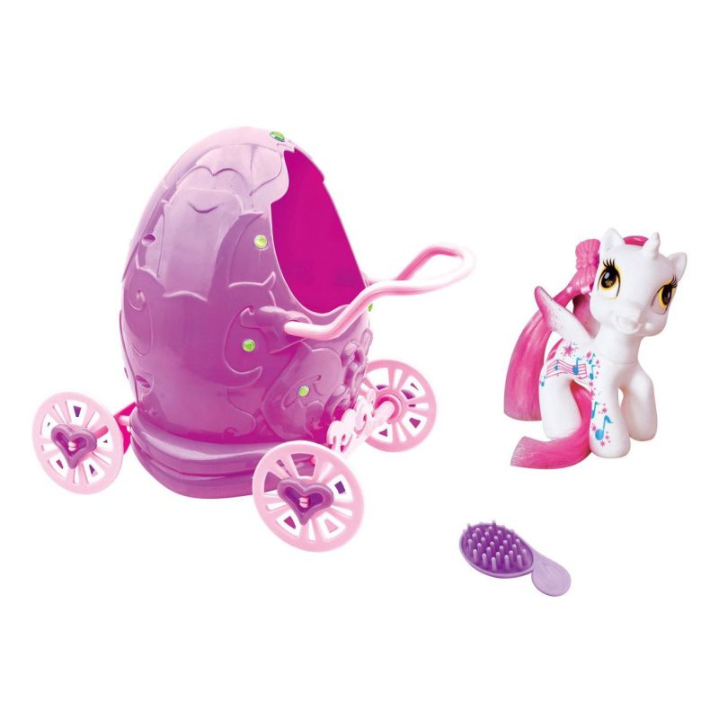Детска играчка - Малкото пони, изработена от качествена и безвредна пластмаса в бял цвят с красива каляска във формата на яйце в лилав цвят и четка за разресване на гривата.