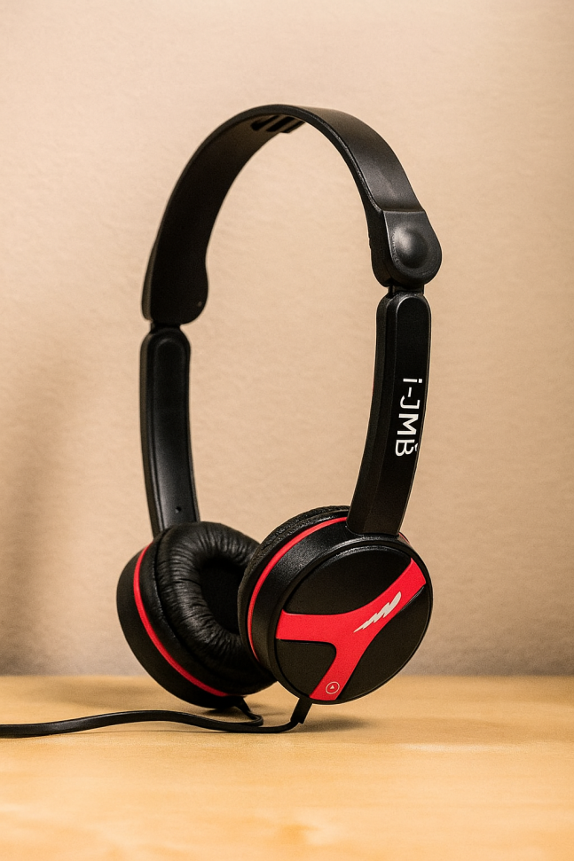 Регулируеми слушалки с наушници с червени и черни детайли.