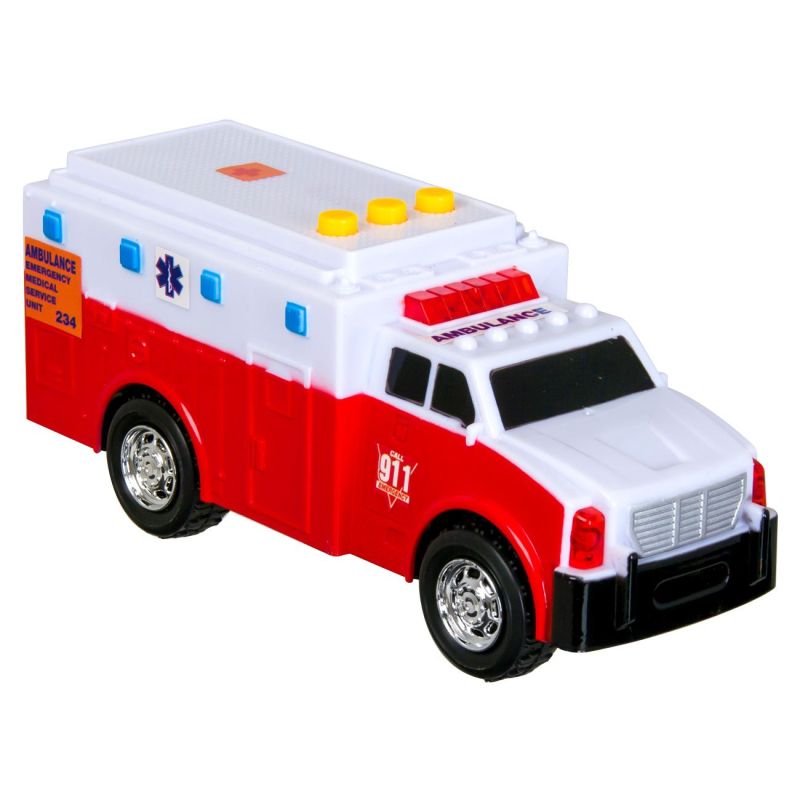 Детска играчка линейка в бяло и червено, изработена от здрава и устойчива пластмаса със светлинни и звукови ефекти.