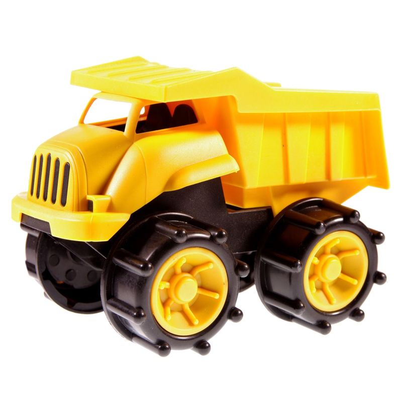 Детска играчка товарен камион самосвал, изработена от здрава и безвредна пластмаса в жълт цвят.