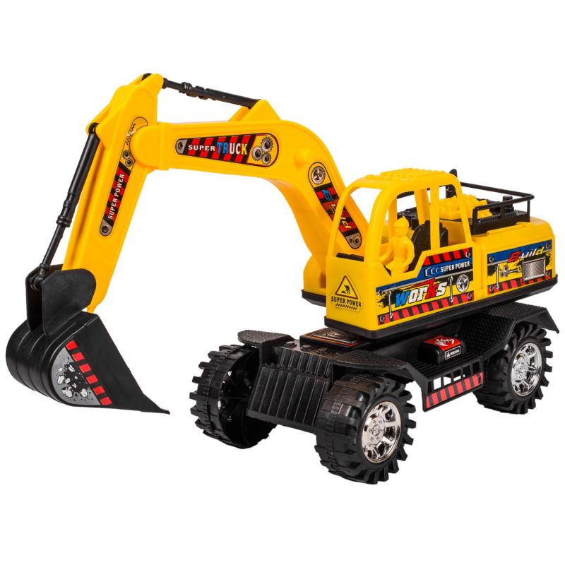 Детска играчка земекопен багер, изработена от здрава и безвредна пластмаса в жълт цвят.
