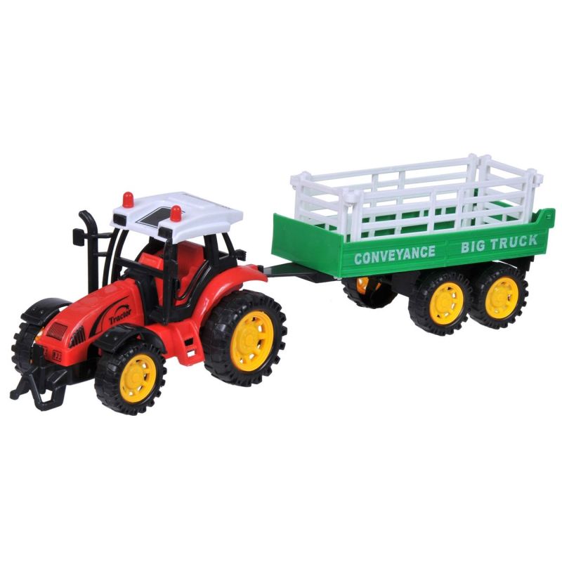 Детска играчка трактор, изработена от качествена и здрава пластмаса в червен цвят с товарно ремарке.