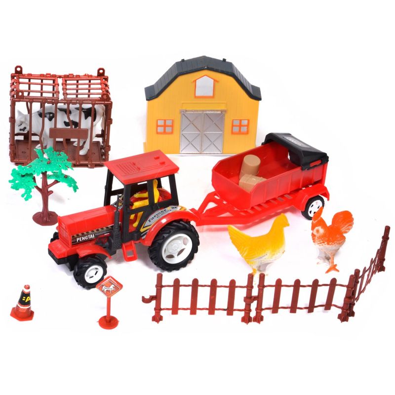 Детски комплект включващ трактор с ремарке, ферма, животни и аксесоари, изработени от качествена и здрава пластмаса в ярки цветове.