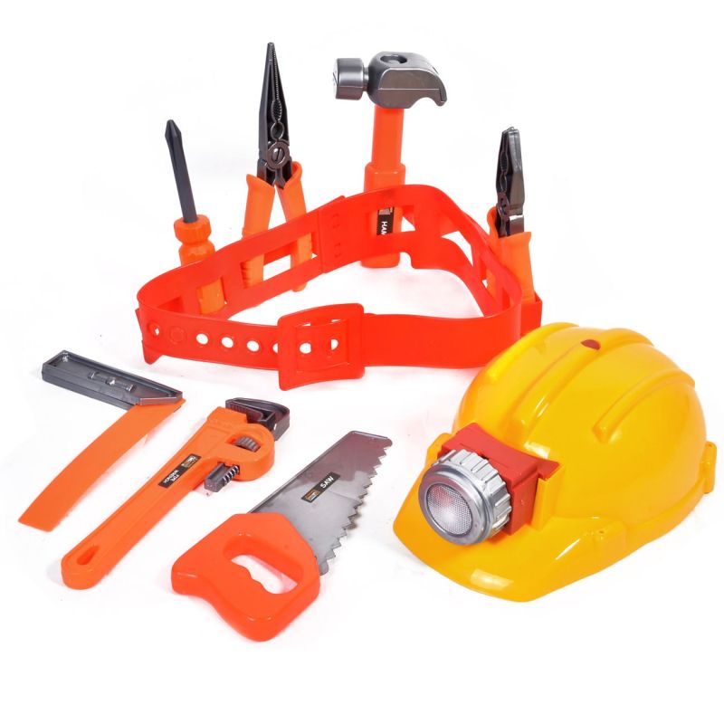 Детски комплект включващ колан с инструменти: чук, отвертка, френски ключ, клещи, трион, ъгломер и каска със светлина.