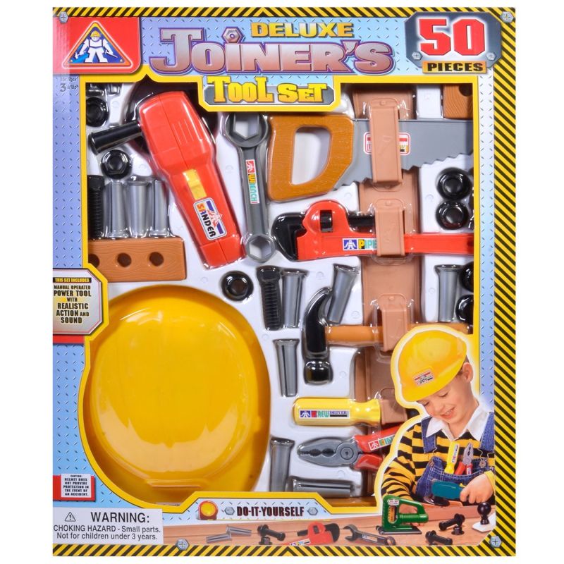 Голям детски комплект включващ 50 различни инструмента: винтове, чук, отвертка, френски ключ, клещи, трион, френски ключ и др. + предпазна каска.