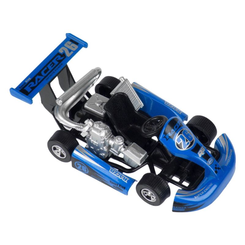 Детска играчка състезателен болид в син цвят, изработена от метал.