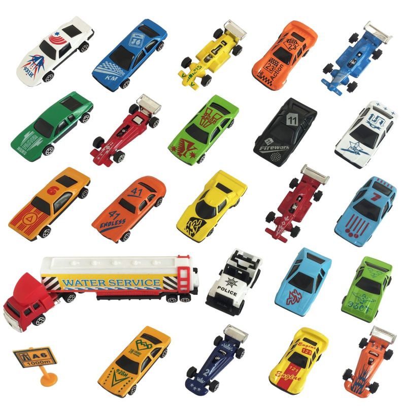 Детски комплект от 23 броя автомобили, товарен камион с ремарке и пътен знак за автомагистрала, изработени от здрава пластмаса и метал в различни ярки цветове.