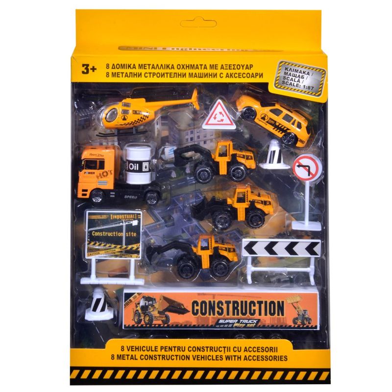 Детски комплект от 6 броя различни строителни машини, изработени от здрава пластмаса в жълт цвят + различни пътни знаци.