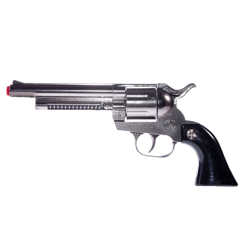 Детски револвер с капси в сребрист цвят с черна дръжка, изработен от метал.