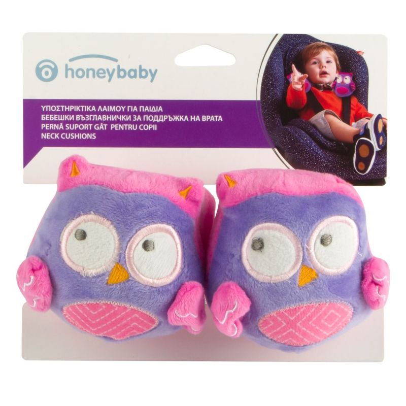 Комплект от 2 броя бебешки възглавнички във формата на симпатични сови в розов цват за поддръжка на врата по време на път в бебешкото столче за кола.