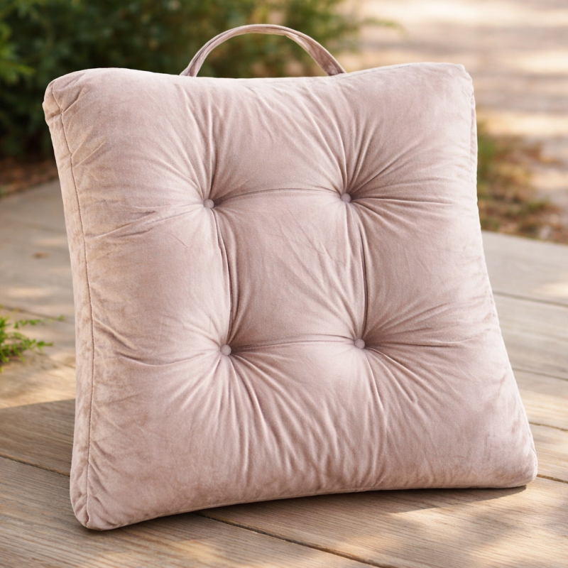 Квадратна декоративна възглавница за стол, изработена от полиестер в цвят шампанско с удобна дръжка за лесно носене.