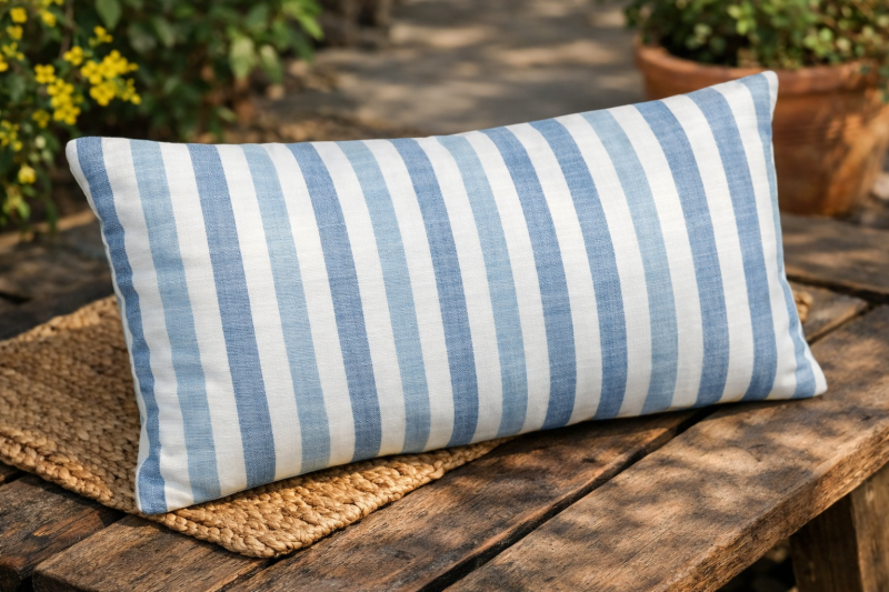 Правоъгълна декоративна възглавница, изработена от полиестер и лен в синьо-бяло райе.