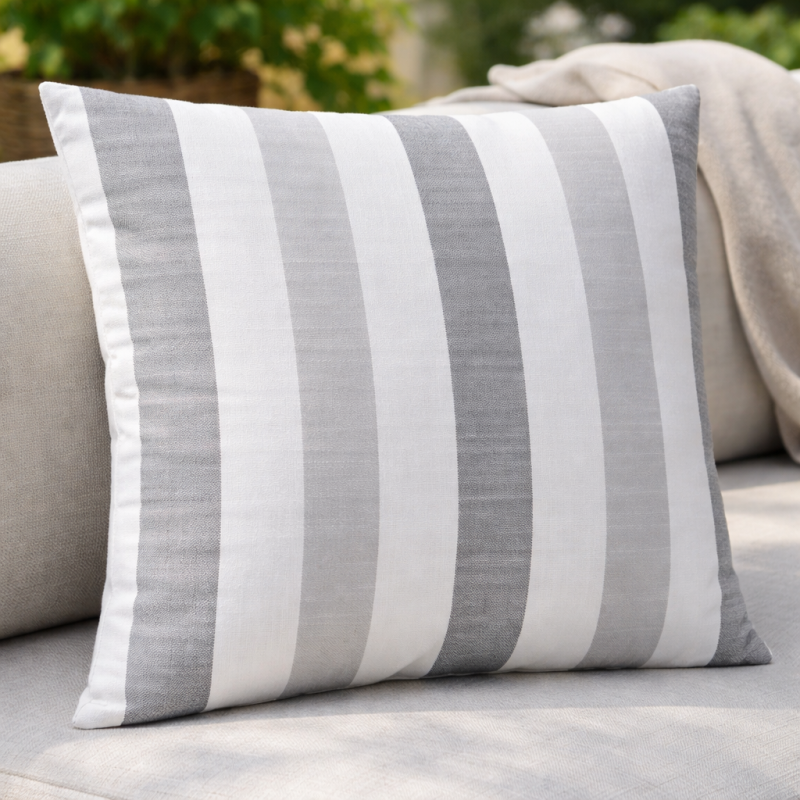 Квадратна декоративна възглавница с цип, изработена от полиестер и лен в сиво-бяло райе.