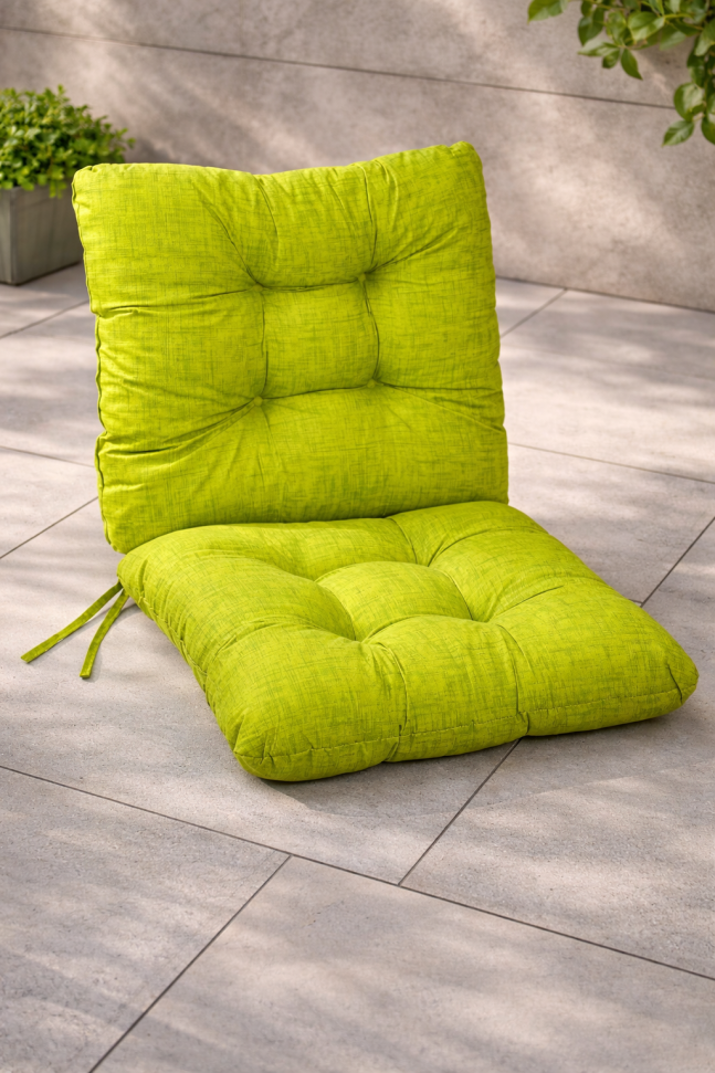 Декоративна възглавница за стол с облегалка, изработена от памук, полиестер и пяна в зелен цвят с практични връзки за стабилно прикрепване към стола.