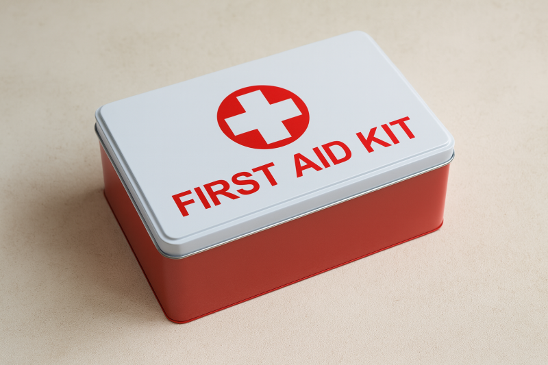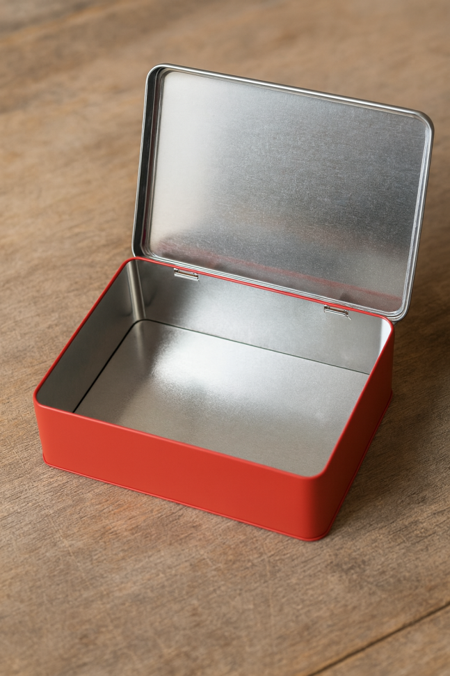 Кутия за лекарства с правоъгълна форма, изработена от висококачествена метална сплав в червено и бяло.