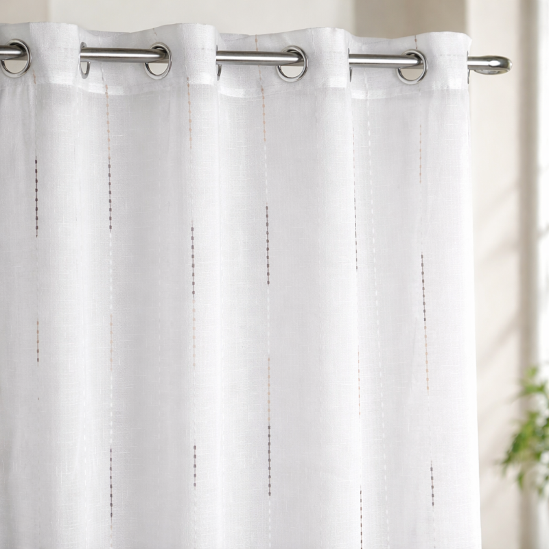 Класическа елегантна завеса, изработена от полиестер в цвят екрю с дисретни вертикални шарки, която гарантира уют и комфорт в интериора.
