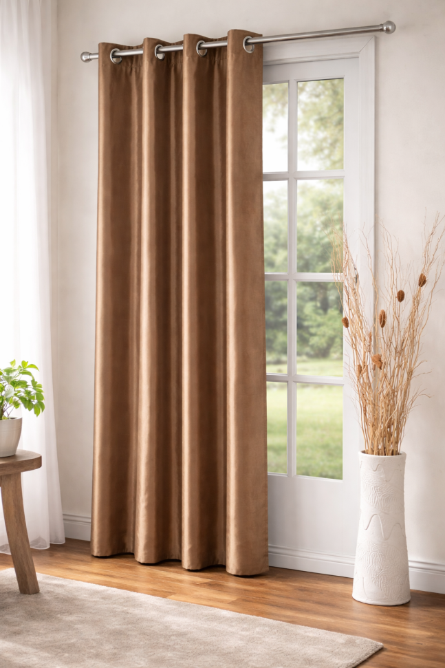 Елегантна завеса, изработена от изкуствена коприна в кафяв цвят, която придава допълнителен стил и комфорт на интериора.