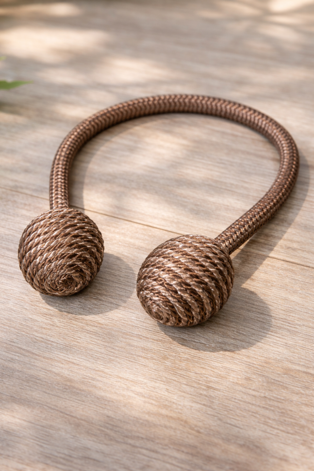 Декоративна щипка за прибиране на пердета и завеси в бежово и кафяво.