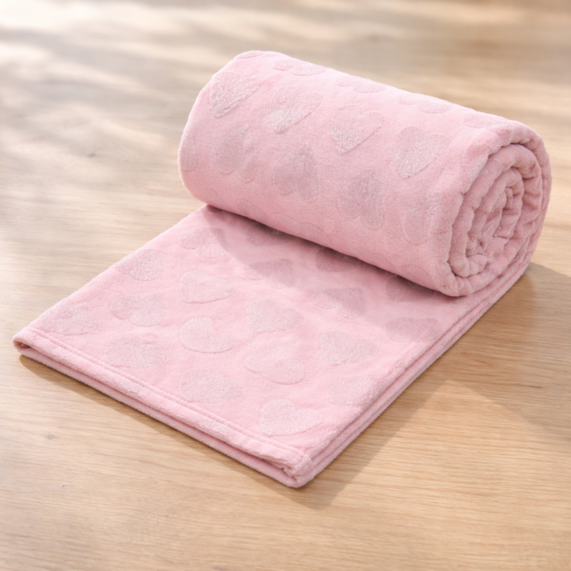 Декоративна кувертюра за диван, канапе, легло и др. в розов цвят с принт на сърца.