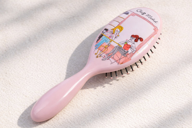 Детска четка за коса, изработена от здрава и качествена пластмаса в розов цвят с щампа на момичета.