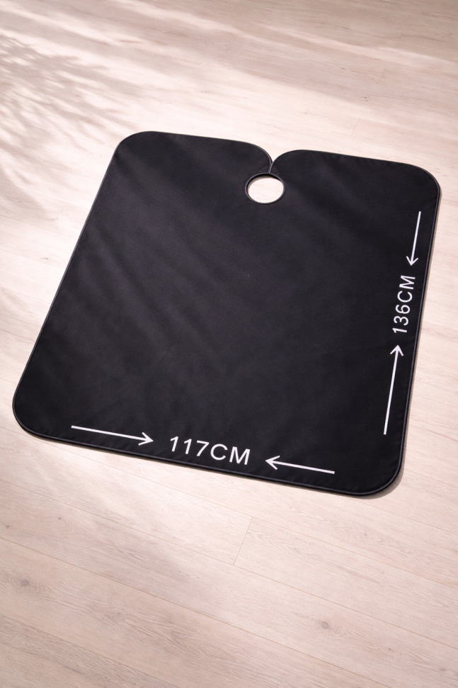 Фризьорска пелерина с правоъгълна форма в черен цвят, изработена от специална материя, която не задържа косми.
