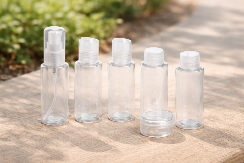 Козметичен комплект за пътуване, състоящ се от мини бурканче за козметични кремове и 5 мини флакона за парфюм, шампоан, блсам и душ гел (50 мл.), изработени от прозрачна пластмаса в практична прозрачна кутия.