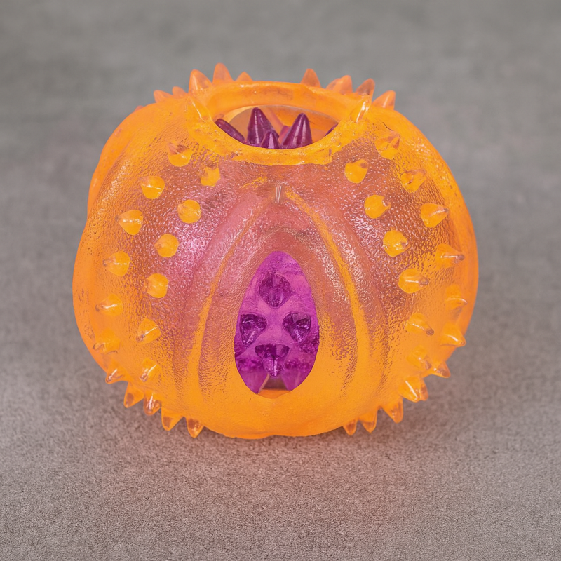 Изработена от меки и нетоксични материали в ярки цветове със светлина, привличаща вниманието на кучето.