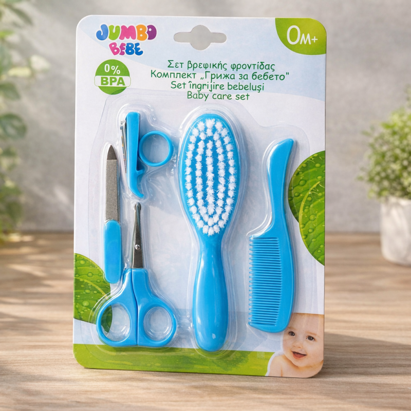 Комплект Грижа за бебето състоящ се от 5 части в син цвят - гребен и четка за коса от изключително меки естествени влакна, ножичка, нокторезачка и пила.