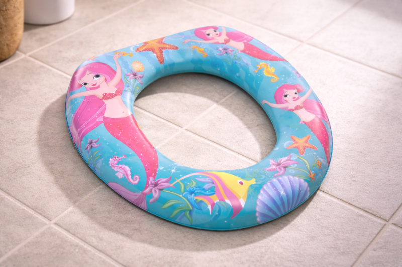 Детска седалка за тоалетна, изработена от качествена и здрава пластмаса с красива цветна щампа на русалки и рибки.