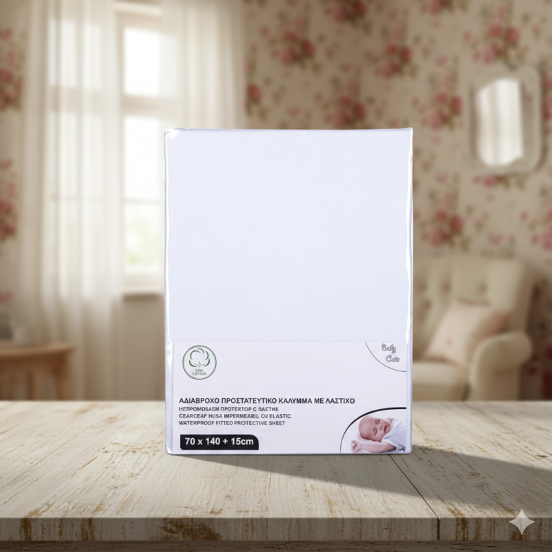 Непромокаем протектор с ластик за бебешко легло, изработен от полиестер и памук с непромокаемо покритие.