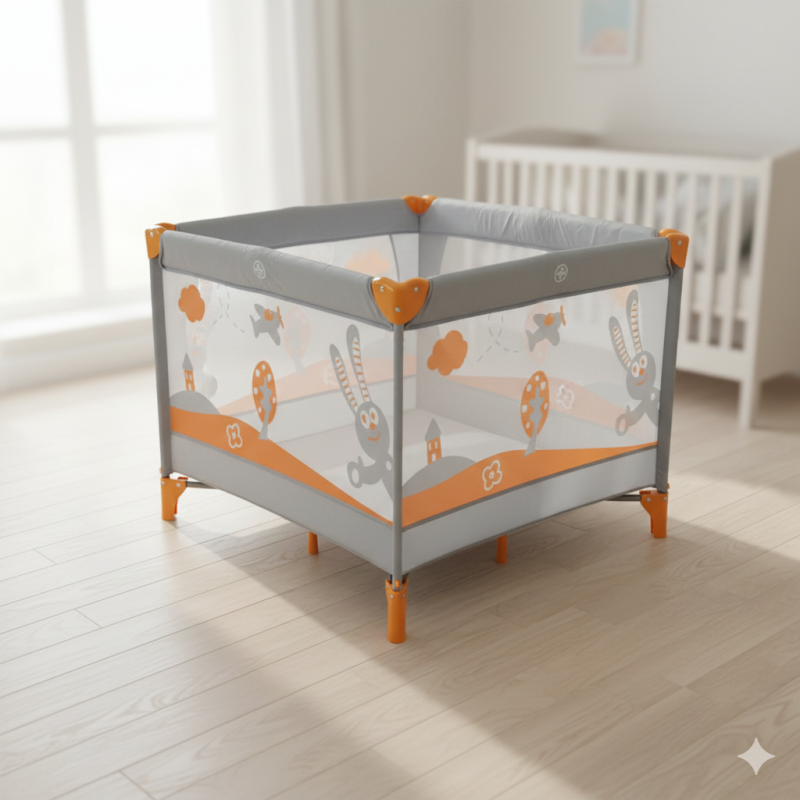 Просторна и стабилна бебешка кошара в сиво и оранжево със забавна картинка на зайче.