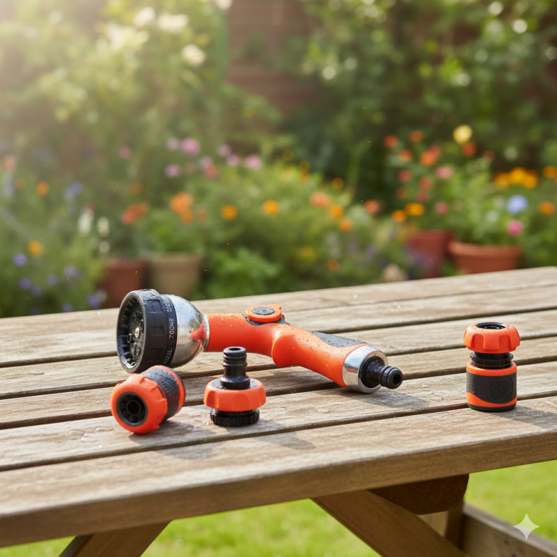 Пистолет, изработен от здрава пластмаса с регулируем накрайник с 8 функции на поливане: плоско-вертикална струя, струя под ъгъл, душ, плоско-хоризонтална струя, конусно пръскане, централно пръскане, твърда струя, мъгла, което позволява избирането на най-подходящ режим за напояване, както и за почистване. Има фиксатор на спусъка за непрекъсната работа.