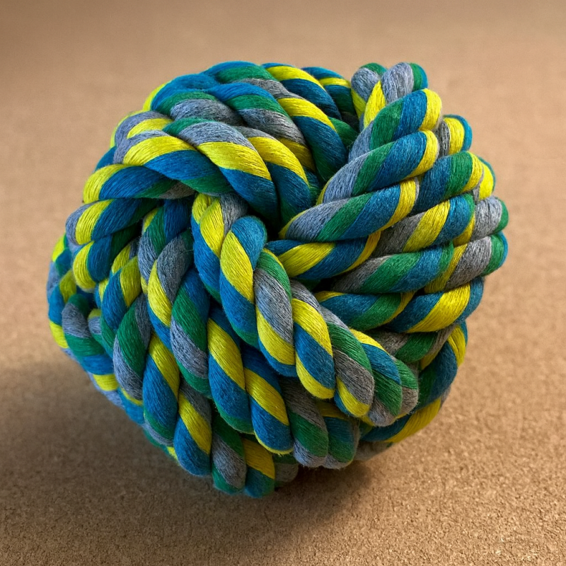 Тъкана играчка за кучета от полиестер във формата на топка със свежи цветове и диаметър 8 см.