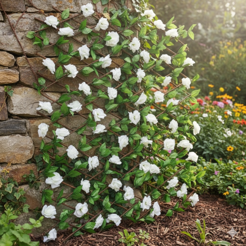 Дървена декоративна ограда тип пергола с декоративни изкуствени цветя и зеленина - цветята са водоустойчиви, а дървесината е устойчива на атмосферни влияния.