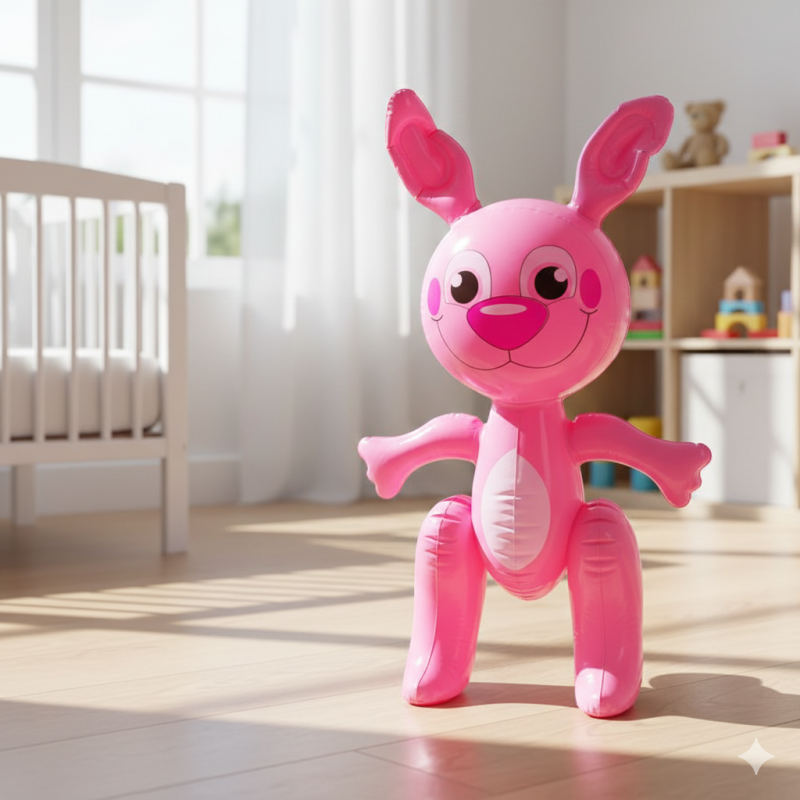 Надуваема играчка във формата на симпатично зайче в розов цвят.